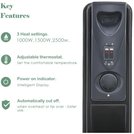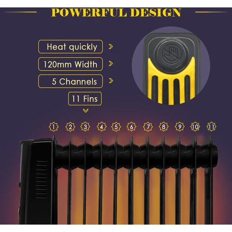 – 2500W oil filled radiator with 11 fins, heat up quickly to distribute warmth across the room.