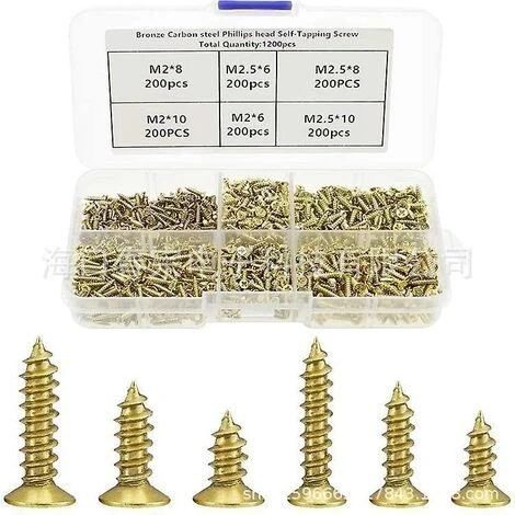 A pack of 1200 small wood screws are packed in a strong box, these screws are fixed in different compartments depending on the size.
