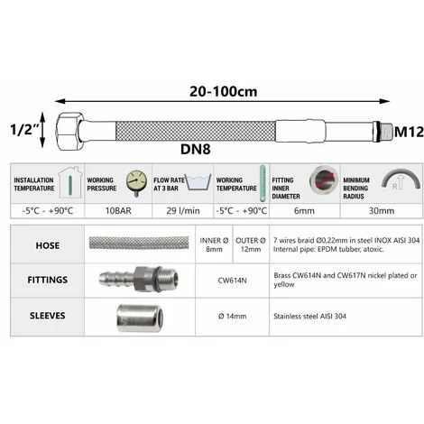 – Internal non-toxic EPDM rubber braided of stainless steel.