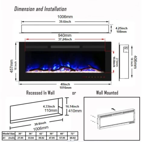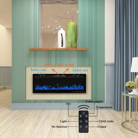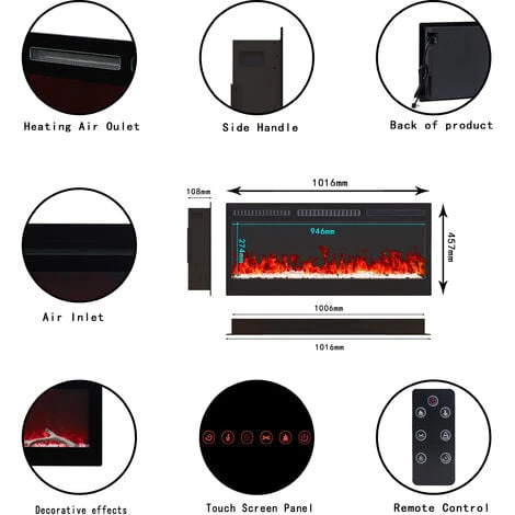 - Adjustable Brightness, Adjustable Flame Color, Adjustable Thermostat, LED Flames, On/Off Switch, Remote Control, Timer, LCD Display, With Natural Pebbles, With Wall Bracket, Wall Mounted, Inset / Freestanding, Crystal Effect Fire Included.