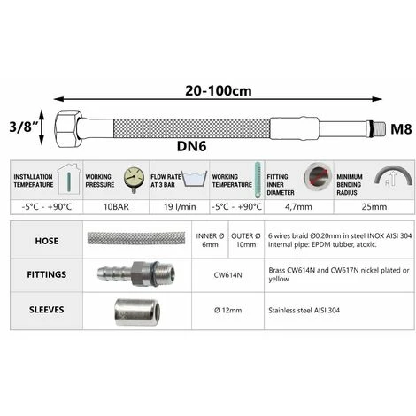 – Internal non-toxic EPDM rubber braided of stainless steel.