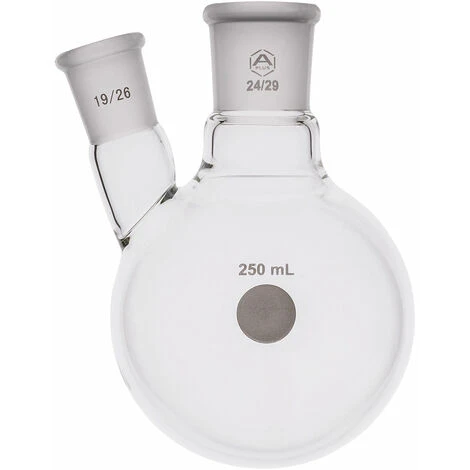 Glass flask from A PLUS with a round bottom and two necks, one of them angled, ideal for a range of laboratory applications.