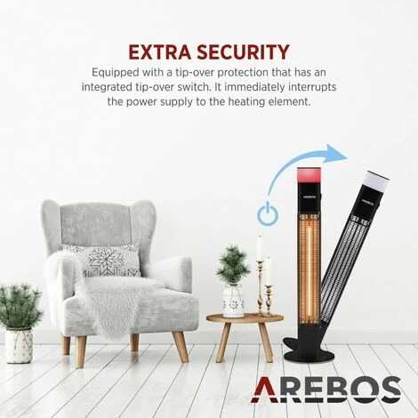 With a heating power of 1500W this heater is very powerful. The infrared technology makes this radiant heater from AREBOS extremely efficient: Heat does not radiate into the ambient air but towards people in the nearby surrounding.