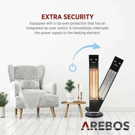 With a heating power of 2000 W, this radiator is especially powerful. Due to its infrared technology the Arebos heat radiator is extremely efficient: The heat does not radiate into the ambient air but aims specifically at people in its surrounding.