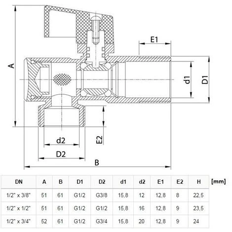 Valve has 1/2 BSP thread inlet (Wall side) and 1/2 BSP outlet.