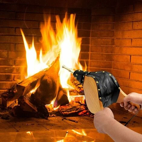 This fireside fan is made of thick plywood and is studded with thick leatherette and rivets to make it strong and durable for a flame more flexible and high intensity.
