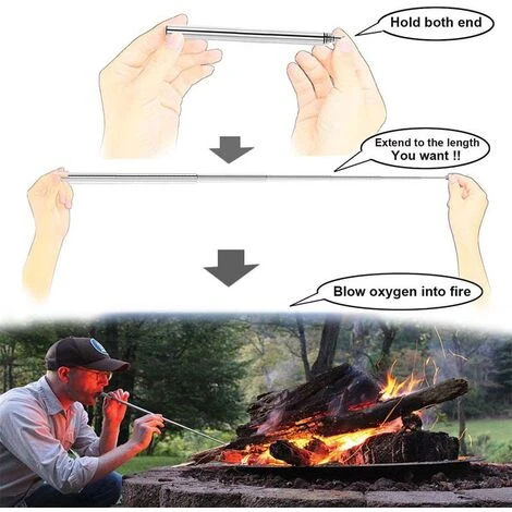 3. Convenient to carry and use: eight sections lengthened 48.5cm, 9.3cm after shrinking. The tube has a telescopic design and can be folded into a pocket size. 4. Retractable Design: The campfire tool can help you blow air to a bonfire easily, the design multi-section makes it not hot or even burn you when you use it. It is easy to carry, and the two ends are designed not to hurt the mouth.