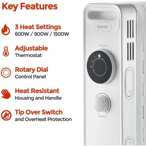 The Igenix IG2615 is an oil filled radiator with 1500W of power so you can keep out the cold this winter with instant heat. Save on central heating by using a portable oil filled radiator to warm up a room in a matter of minutes. The radiator has a host of features such as a Dial Control Panel to easily adjust the heat, Rolling Castors for easy manoeuvrability around your home and Heat Resistant Housing to make it safe for children and pets. Adjust the radiator to make your room the perfect temperature with 3 adjustable heat settings. To make sure you can operate the radiator safely it has Overheat Protection and a Tip Over Switch that will stop it overheating and automatically cut off if tipped over so you can switch on the radiator and leave it in the room to heat up without worrying.