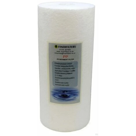 Finerfilters 10 Jumbo Spun Sediment Filter 10 Micron Pre Filter 10 Micron Cartridge Polypropylene Replacement cartridge for removal of Sand, Silt, Dirt and Rust particles for water use only. This cartridge fits most standard 10 jumbo water filter housings. You can find our Finerfilters jumbo housing in the recommended section below. Best suited to high flow applications. Jumbo cartridges have around 4 times the dirt holding capacity as a standard cartridge. Maximum Water Temperature: 125°F / 52°C Micron rating is nominal. Installation and housing design can affect performance. This filter will not remove cysts, bacteria or viruses. Dimensions: 10 x 4.5 Weight: 480g