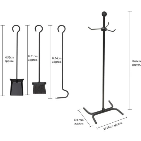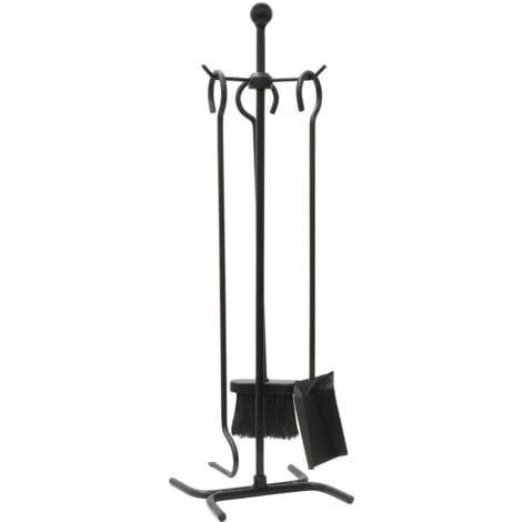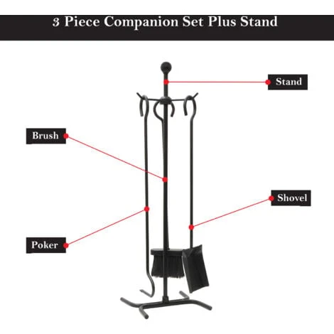 Three piece classic fireside tool set, includes poker, brush and shovel held on a stand
