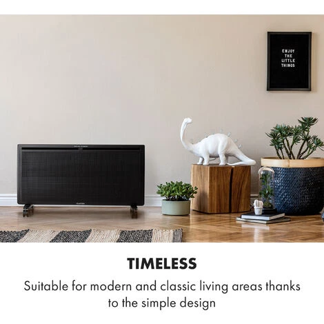 The 2000 watt heating element can be continuously adjusted between 5 and 45 ° C and can therefore be optimally adapted to individual heating requirements. The 83 x 40 cm heating panel can be attached directly to the wall or used as a mobile standing device. Two stable feet, each with two rollers, and a 150 cm long cable ensure the necessary mobility. With 2000 watts of power, it heats rooms up to 40 m² in size without any problems. A weekly timer enables the heating times to be programmed as required for each day of the week – so a pleasantly warm room is always guaranteed. In addition, the OpenWindow Detection ensures automatic shutdown when the window is open. All settings can be made directly on the heater’s control panel. Thanks to its clear LED display, you always have an overview of the current settings. An adjustable child safety device, which prevents accidental switching or switching on, as well as an integrated overheating protection provide additional safety. The Klarstein Hot Spot Slimcurve Double Wave heater not only shines in terms of technology, it also impresses with its stylish design: the rounded edges and shiny surface exude cosy warmth as well as a touch of luxury.