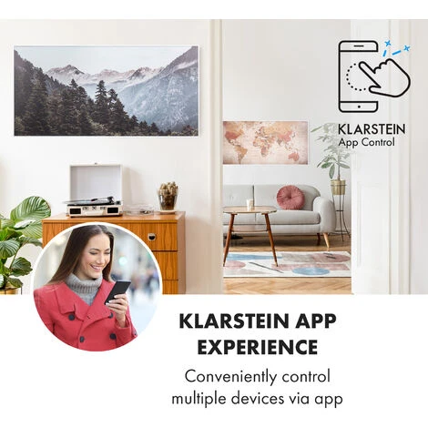 The Klarstein Wonderwall Air Art Smart infrared heater combines highly efficient heating power with attractive design and the latest technology. The 120 x 60 cm heating panel can be hung directly on the wall and is hardly larger than a framed picture. With its powerful 700 Watt output and owing to IR ComfortHeat it spreads very pleasant heat for the human skin without getting lost in the air. Owing to infrared technology, the heating panel is extremely energy-efficient and environmentally friendly, as a full 98 % of the power is converted into radiant heat. Smart functions for control via app, thermostat, auto switch-off function and IP44 protection class skilfully round off the innovation.