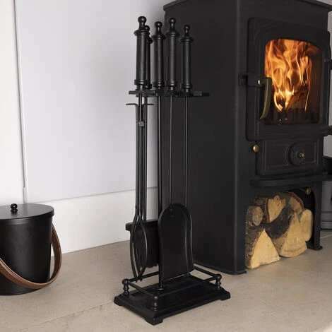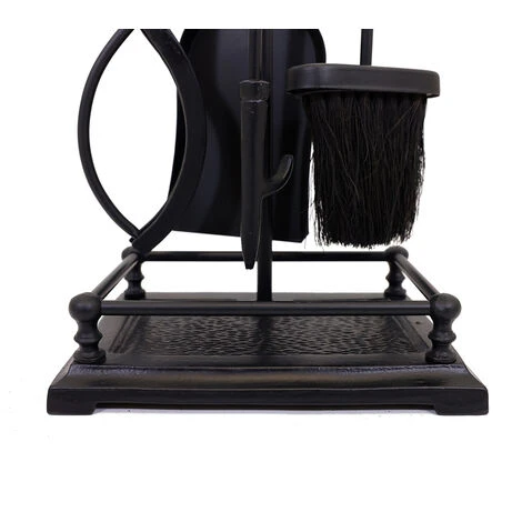 This 4 piece companion set has iron frames with aluminum handles. It features a pair of tongs, a brush made from natural coco fibers, a poker and coal shovel. Its rectangular base features a perimeter surround, holding any fallen ash or debris within its bounds. The traditional design and the black matte finish make this companion set a must for those cold nights by the fireside.