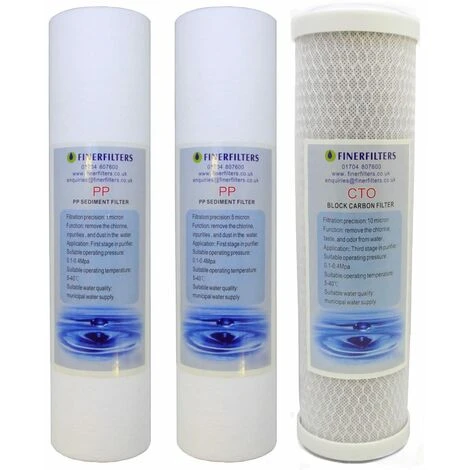 Reverse Osmosis 3 Filter Set to Fit All 10 Standard Drop In Style Housings Pack Contains; 1 x 1 micron Spun 10 x 2.5 Sediment Filter 1 x 5 micron Spun 10 x 2.5 Sediment Filter 1 x 5 micron 10 x 2.5 Carbon Block Filter