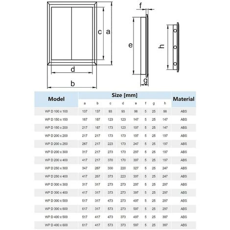Inspection panel provides simple and easy access through walls and dry lined ducts and units to access concealed plumbing, switches, valves, shut off valves, fuse boxes , commands and connections. This specially designed product saves time and money over traditional steel or millwork access doors. They offer excellent aesthetic appearance, are factory finished and simple to install. The panel is fully removable for easier access and comes in a textured gloss white finish. Specifications: – Color: White; – Size: 100x100mm, 150x150mm, 150x200mm, 200x200mm, 200x250mm, 200x300mm, 200x400mm, 250x300mm, 250x400mm, 300x300mm, 300x400mm, 300x5m00m, 300x600mm, 400x500mm or 400x600mm;